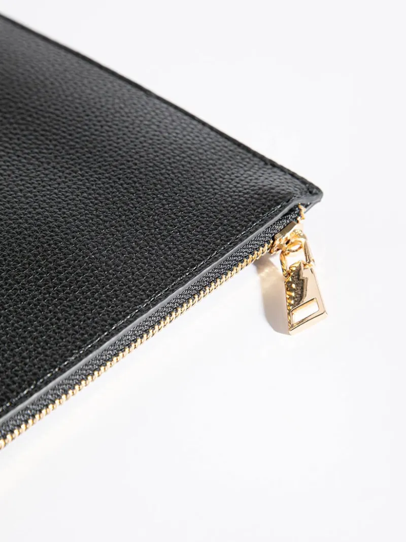 The 15″ Large Laptop Sleeve in black has a gold zipper and an inside pocket, keeping your laptop stylish and secure.