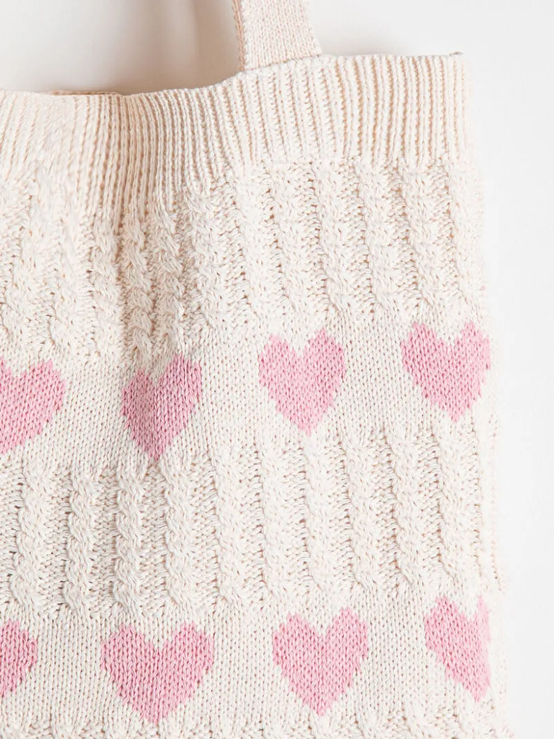 Perfect for weekend markets or casual brunches, this knit tote bag adds a little love to any look.