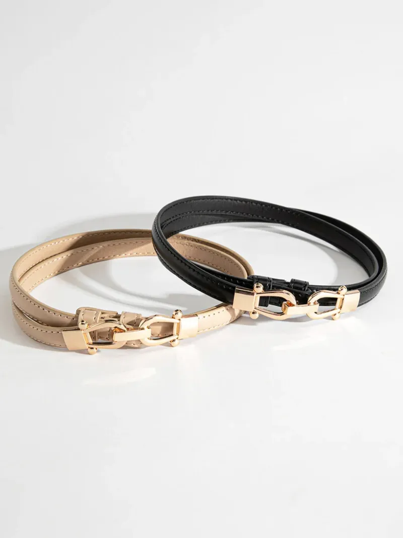 Belt it out. This is a 2-pack of skinny belts (one brown, one black) that are adjustable and come in your choice of gold…
