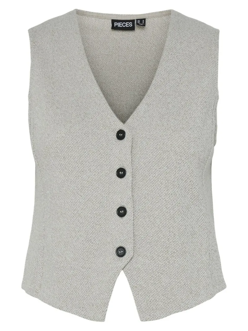 The Pepper Vest from Pieces features a classic design with four buttons down the front, offering a sleek and tailored look. Made from a comfortable cotton-polyester blend and available in two versatile colors, it’s a perfect layering piece for any outfit.NOTE:Pieces sizing may be slightly different than Ricki’s. Please view the Fit Guide to get the perfect fit.