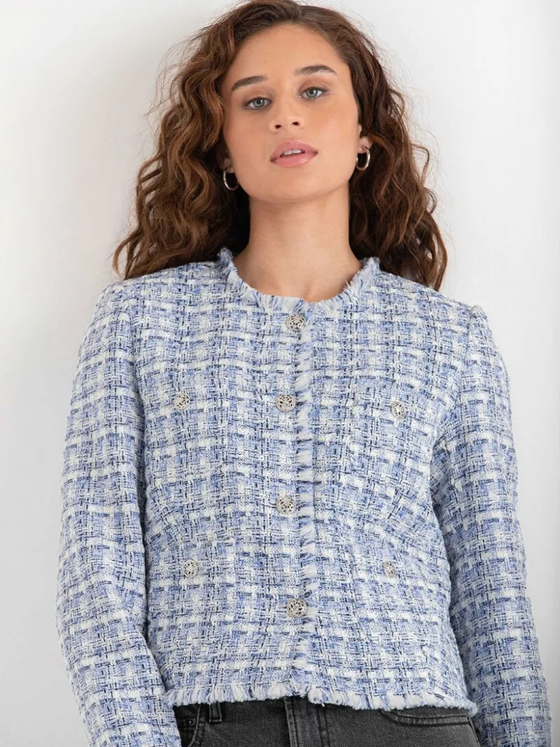 Inspired by the classic designer style, this cropped boucle jacket is a versatile and timeless piece