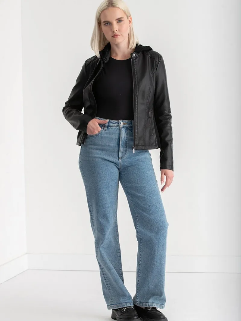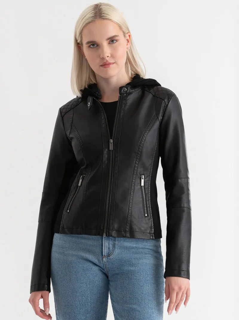 This faux leather jacket with hood features a moto-inspired design with a snap mock neck and shoulder stitching details. The ribbed sleeves and side panels create a slimming effect, while a removable cable knit hood gives you the option for added warmth.