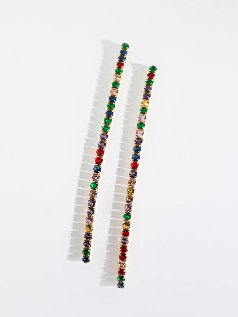 The Long Cubic Zirconia Earrings feature vibrant, multi-colored stones in a 14K gold-plated setting, with a 5-inch drop and hypoallergenic stainless steel posts.