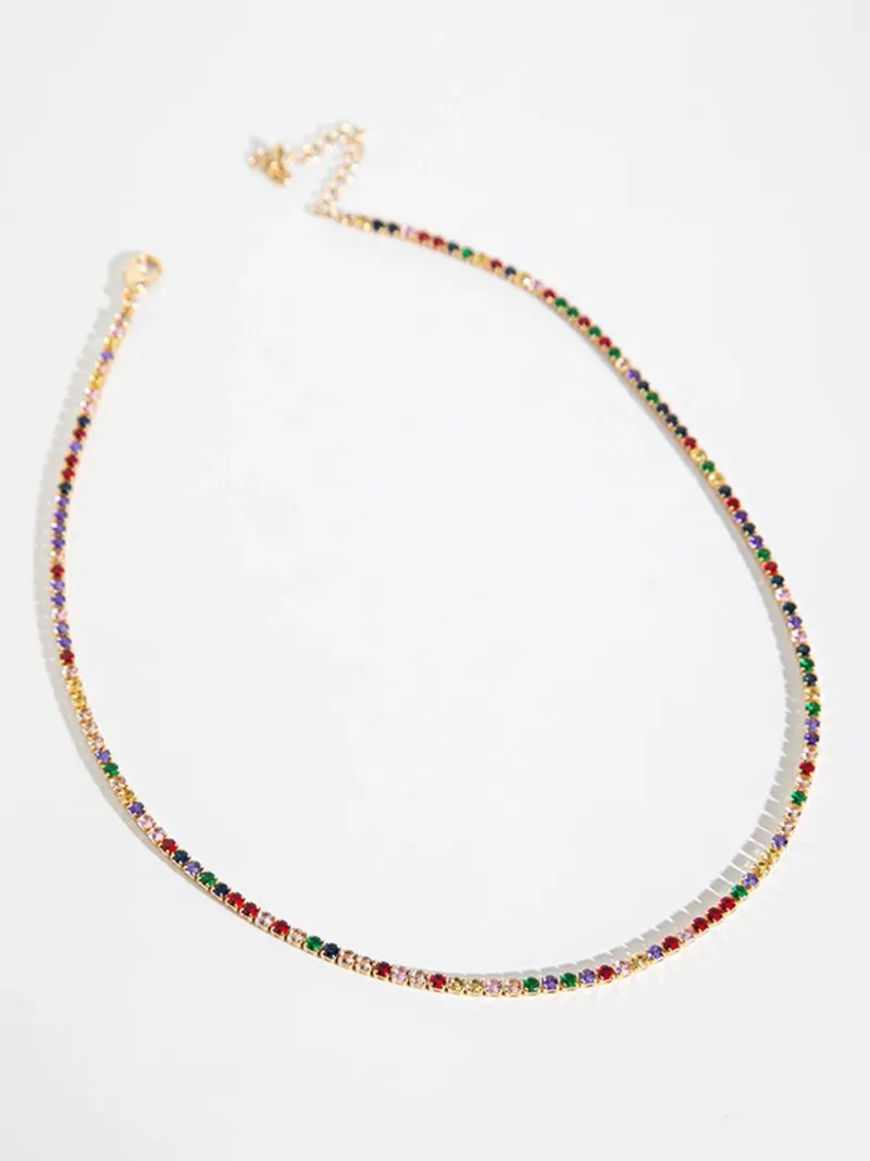The 3mm Coloured Stone Tennis Necklace features a stunning array of multi-coloured stones on an 18″ chain, beautifully crafted with 14K gold plating and an adjustable chain extender for a perfect fit.