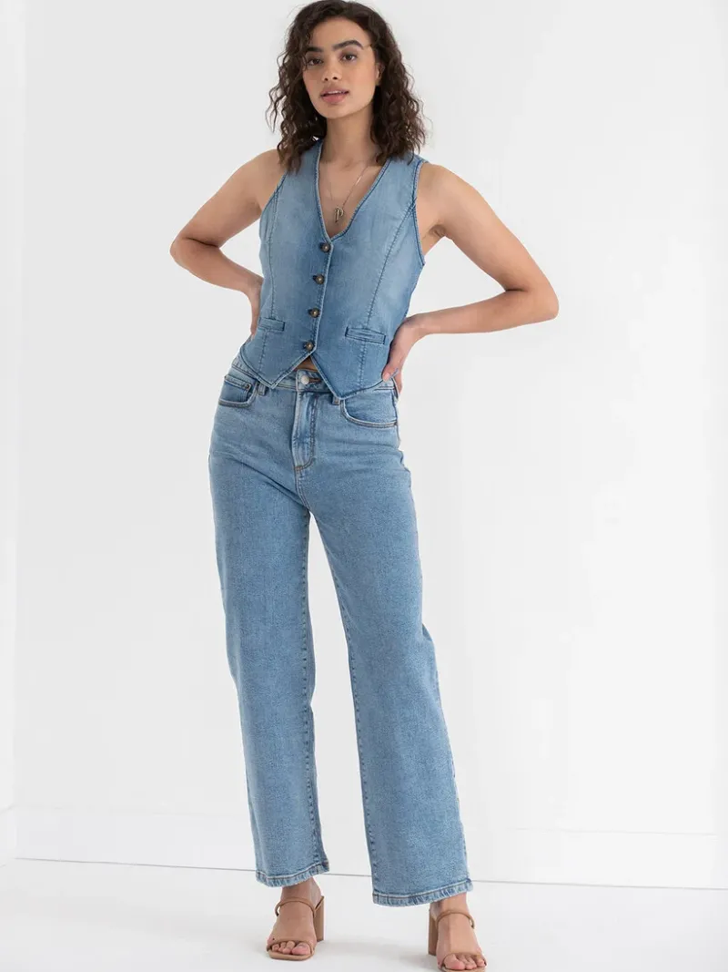 Invest in your denim collection. This piece has vintage vibes with functional pockets, a v-neck design, and standout black stitching, helping you add a cute touch any outfit.
