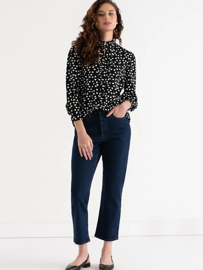 Add a little frill to your next look. Featuring a band collar and cascading ruffles on the upper placket, this blouse makes for easy everyday styling. Crafted from a light fabric, it’s perfect for summer but has year round versatility.