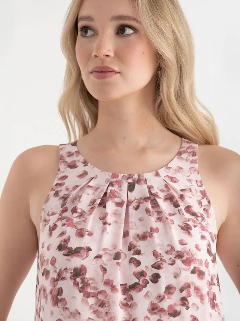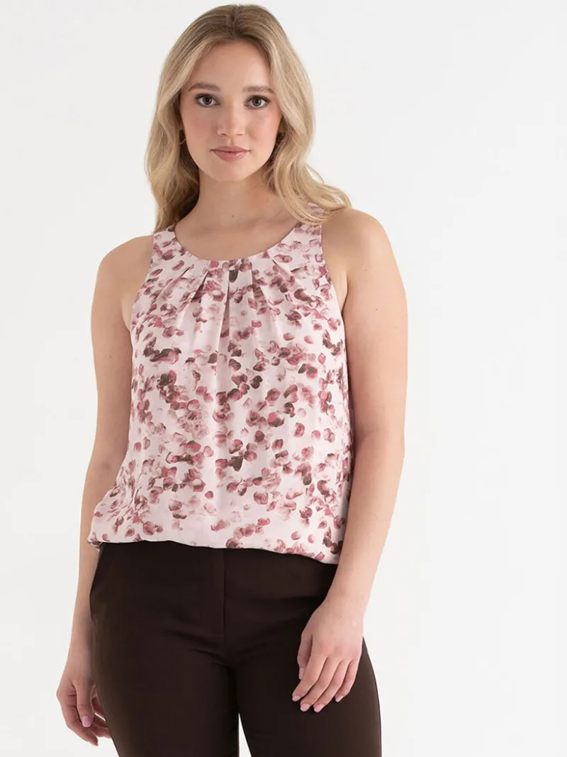 This is a lined, sleeveless, and gracefully drapey blouse. The pleated neck detail brings a dash of polish while the curved hem lands just where your hip wants it to. It’s a versatile piece that can be dressed up or down.