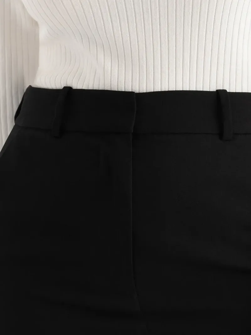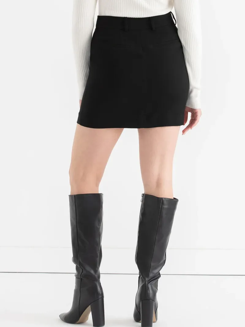 The Evan Crepe Mini Skirt is a must-have in women’s clothes, hitting perfectly at mid-thigh with a stylish fly front, belt loops, and front slant pockets for a polished yet playful look you’ll love.