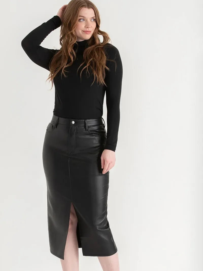 It’s pleather weather. Cooler fall days are in the forecast and this faux leather midi skirt, available in black or brown, is your new autumnal obsession. It features front and back pockets, a fly front and belt loops, plus the front slit is perfect for showing off those fall boots or a little leg.