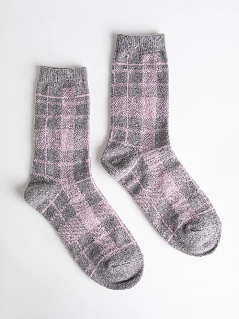 These crew socks feature a plaid pattern and are made from a super soft poly blend with enough stretch for a comfortable all-day fit.