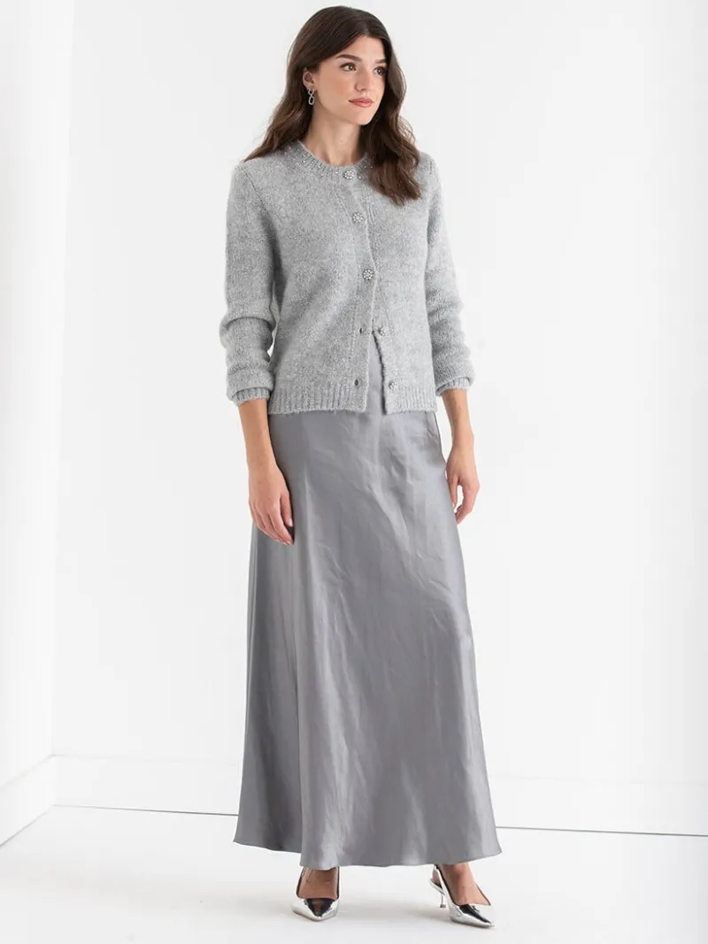 Step up your sweater game with the Jewel Detailed Cardigan—this women’s sweater hits at the upper hips and dazzles with rhinestone accents, delicate bead details, and silver flower buttons for a touch of sparkle and refinement.