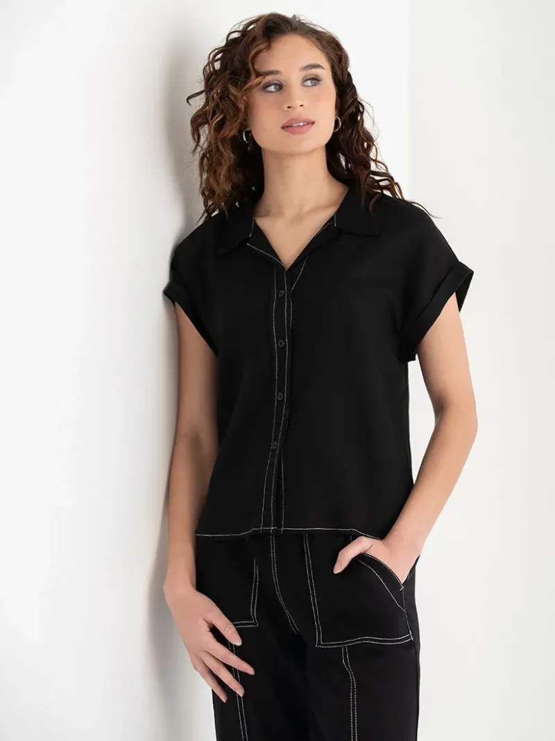 The Linen Button Up Top is your go-to vacation piece with its cool linen-blend fabric, flattering hip-length fit, and relaxed, stylish details—ready to join you on any winter getaway.