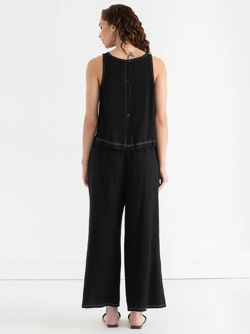 This linen tank top adds a little something extra to your look with a back button detail. Casual but refined, it’s perfect for resort getaways and the summers afterward.