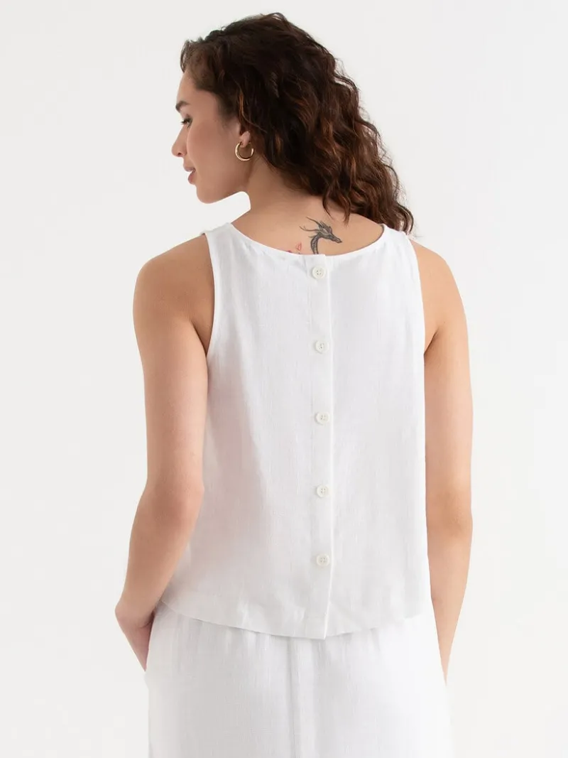 This linen tank top adds a little something extra to your look with a back button detail. Casual but refined, it’s perfect for resort getaways and the summers afterward.