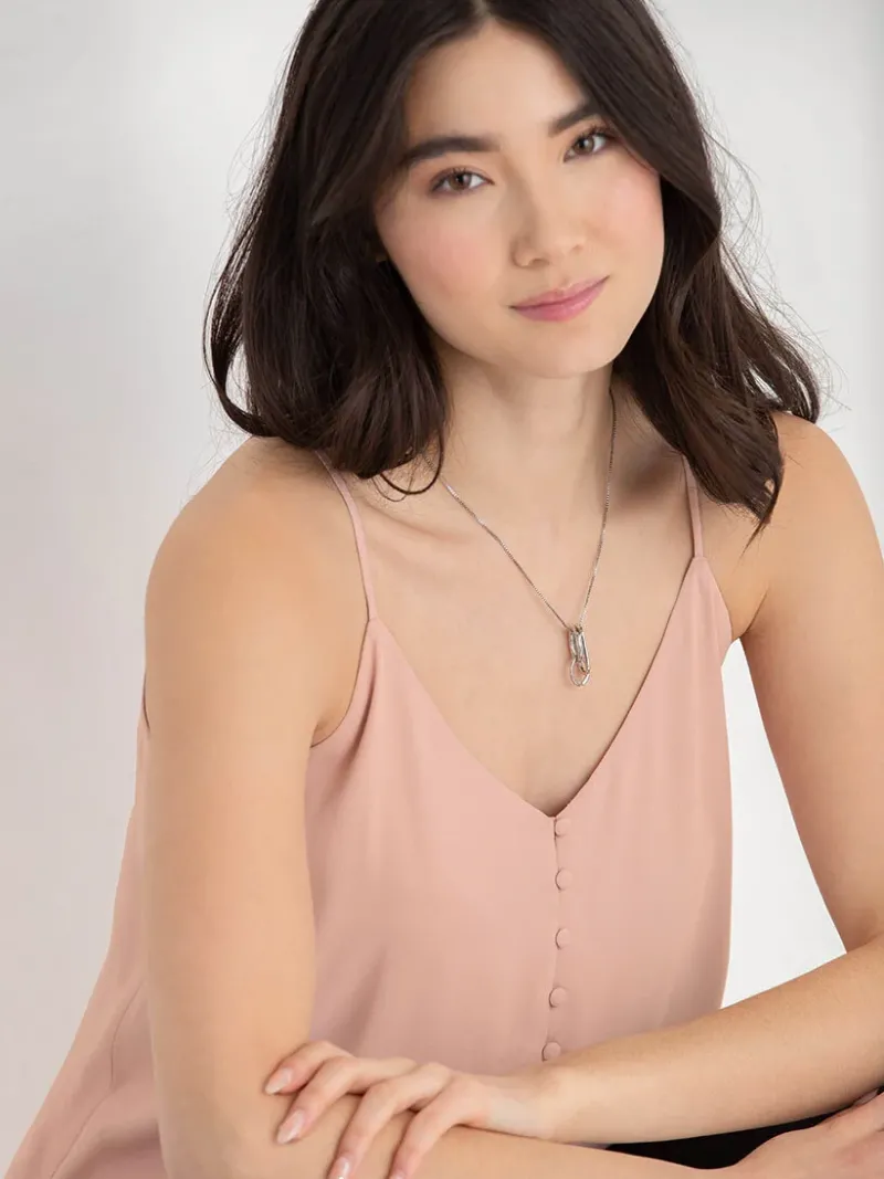 This is a lined tank top in a relaxed fit that makes for easy styling in any season. Notice the feminine details like dainty straps and cute button placket.