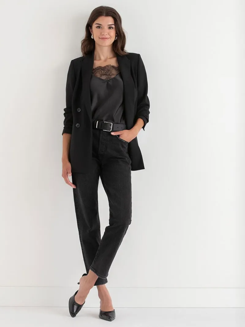 Smooth like butter. This satin camisole has adjustable spaghetti straps and a V-neck with front and back lace detail. It…