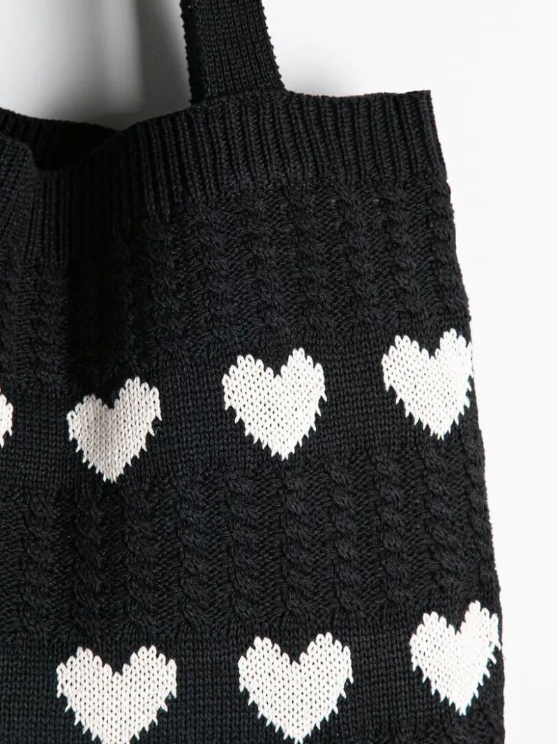 Perfect for weekend markets or casual brunches, this knit tote bag adds a little love to any look.