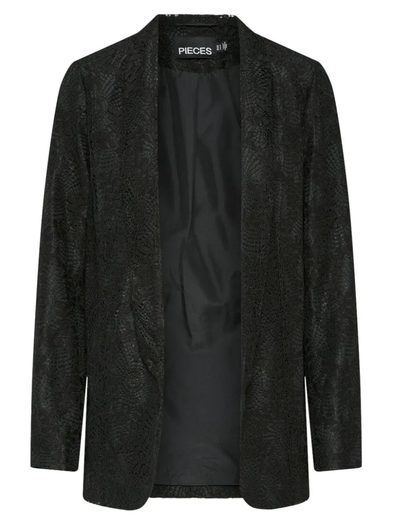 This lace blazer can elevate any outfit with its shawl lapels, tailored look, and satiny lining. NOTE: Garments by Pieces may have slightly different sizing than Ricki’s. Feel free to check your size with the Pieces Fit Guide.