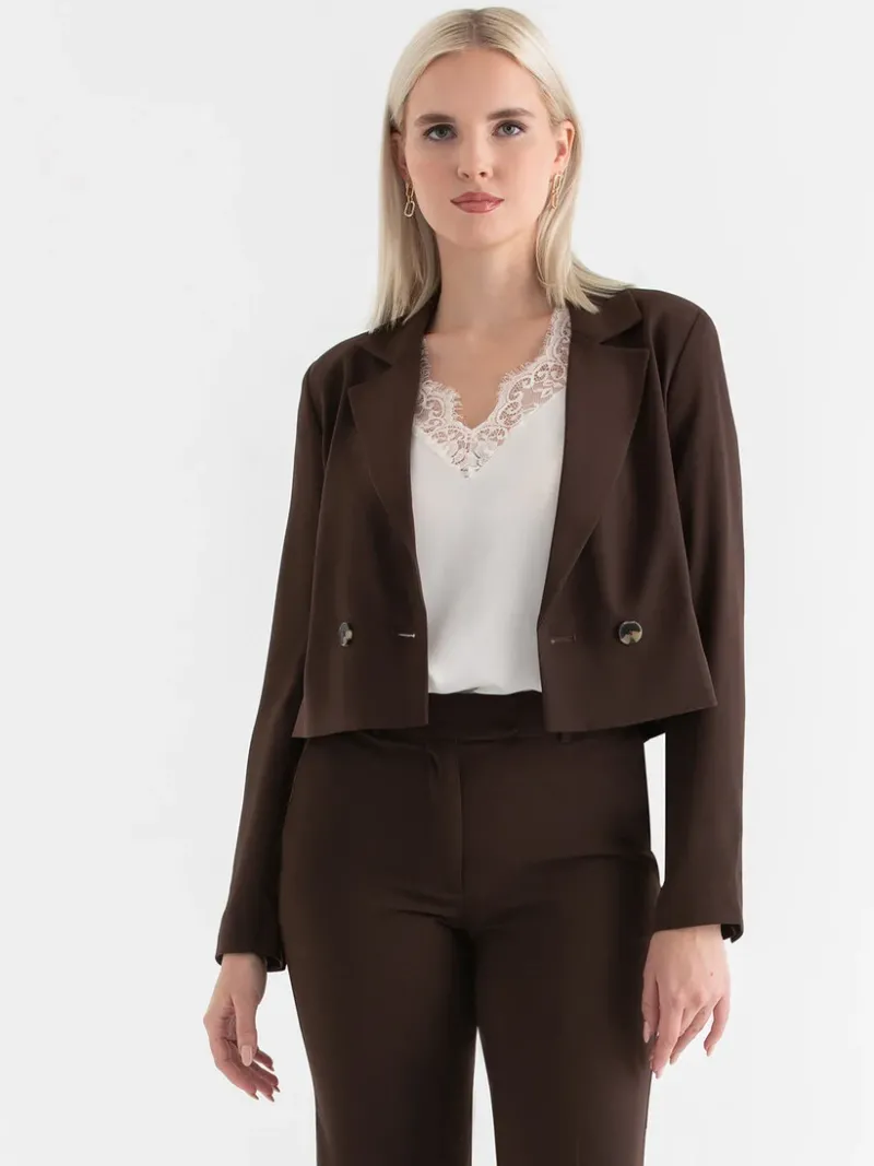 The Crop Blazer in Crepe, available in sleek black (online only) or rich coffee bean, hits right around the waist with a flattering double-breasted design, polished notched collar, and luxe satin lining—perfect for an easy, tailored look.