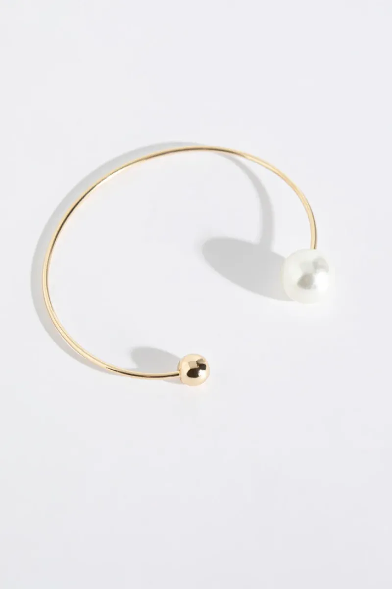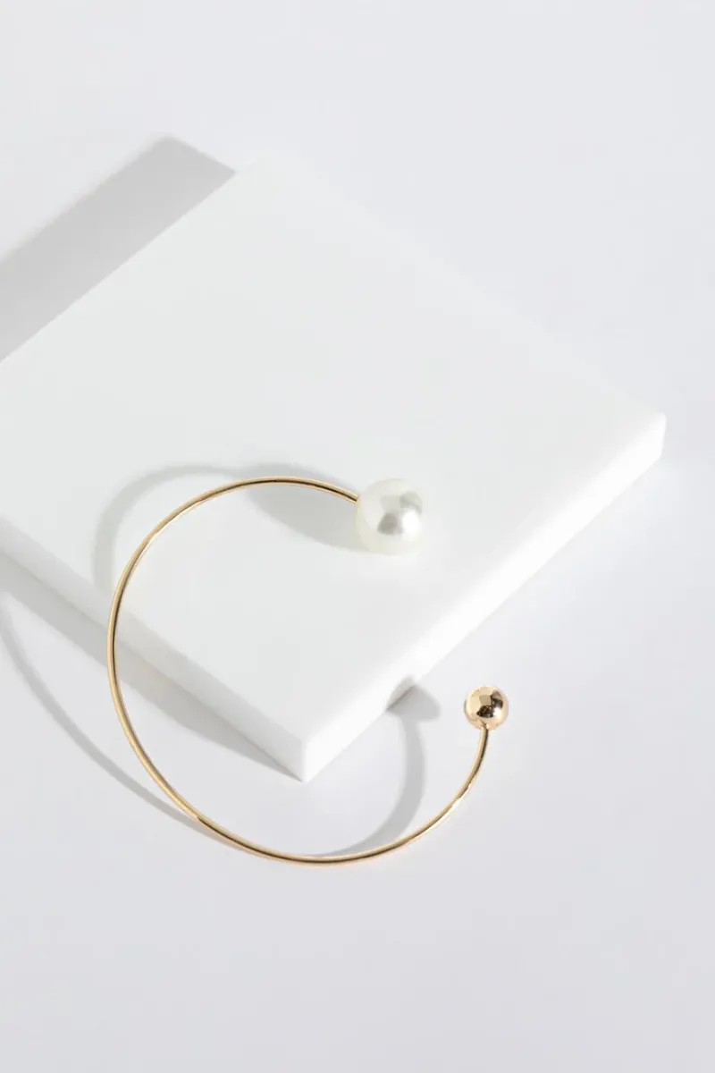 The 14K Plated Gold & Pearl Bracelet features a stylish cuff design with a stunning glass pearl, beautifully crafted from adjustable 14K gold plating for a touch of elegance.