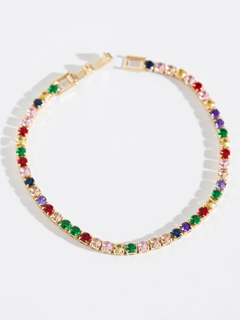 Featuring multi-coloured rhinestones in 14K gold settings, this is a classic and easy-to-style tennis bracelet to help you add a little flair to any look.
