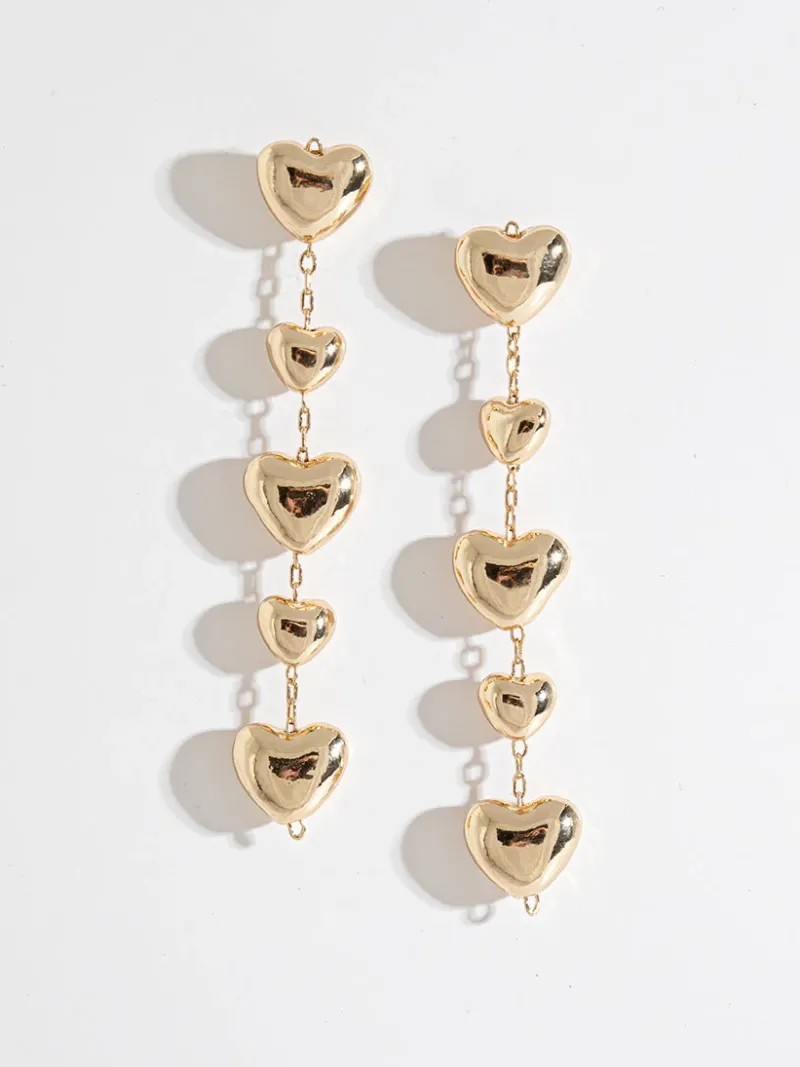These 14K gold plated dangle earrings feature five solid hearts in alternating sizes to help you add a little love to any look.