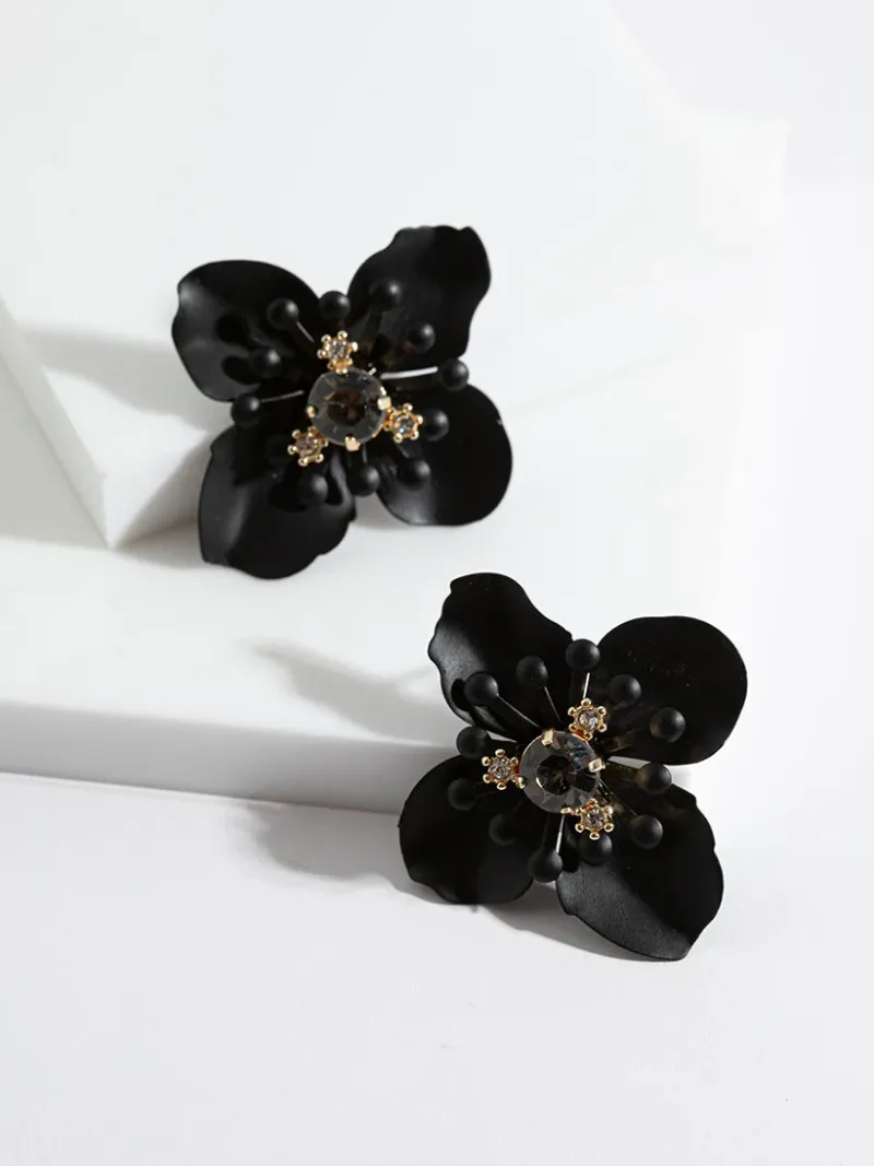 These flower earrings feature realistic-looking metallic pedals and rhinestone centers to help you add a delicate feminine touch to any look.