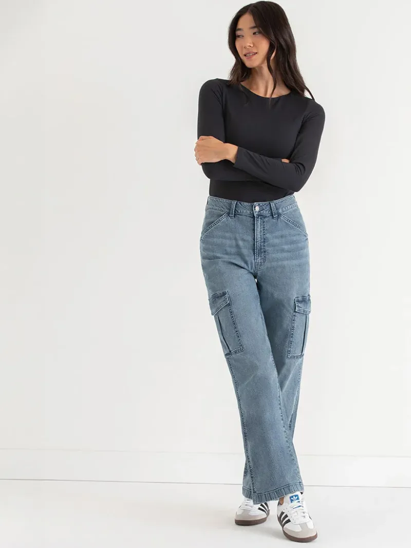 Endless appeal, endless pockets. These cargo jeans come in a roomy straight fit and feature a high rise, pointed flap cargo pockets, and angled front pockets. Notice the mid-wash denim for instant thrifted charm.