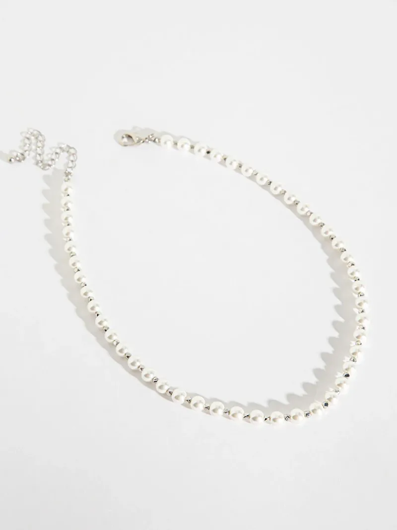 The classic pearl necklace. This is a shorter-length pearl necklace with silver metal accents – a timeless piece that wi…