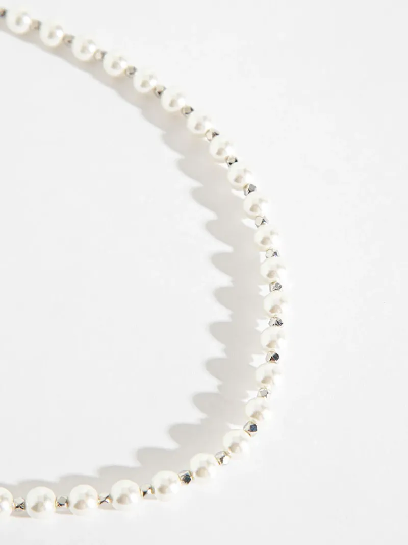The classic pearl necklace. This is a shorter-length pearl necklace with silver metal accents – a timeless piece that will always be on trend.