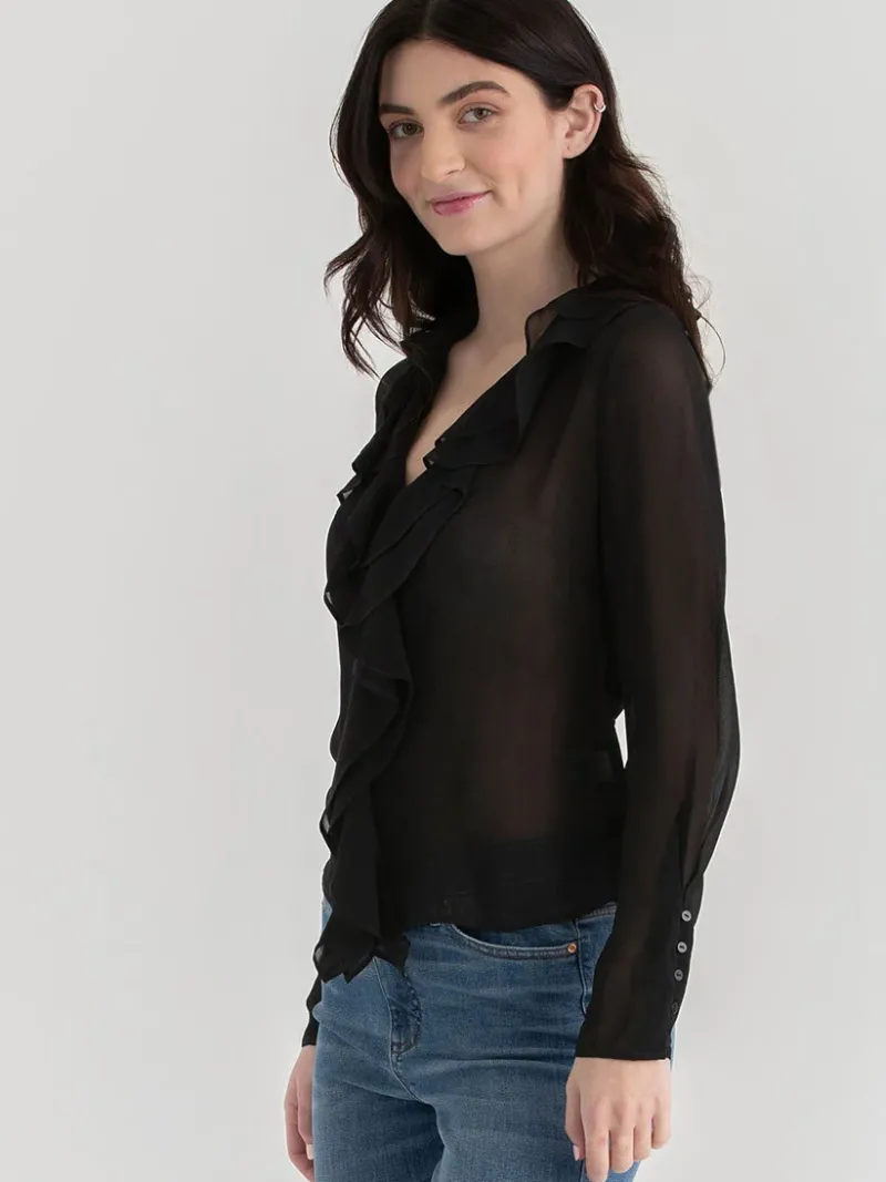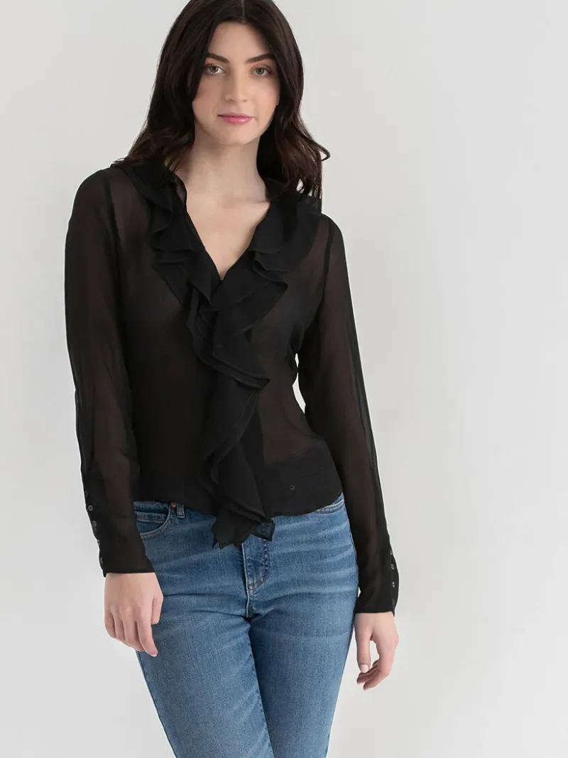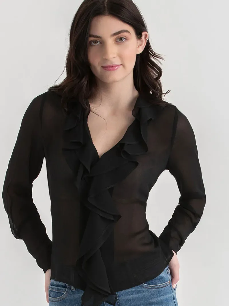 For when you’re feeling a little fancy. With a ruffle neckline that runs down the front placket, this button-front shirt offers you plenty of styling options. It’s made with a gauzy sheer fabric that’s great for summer layering.