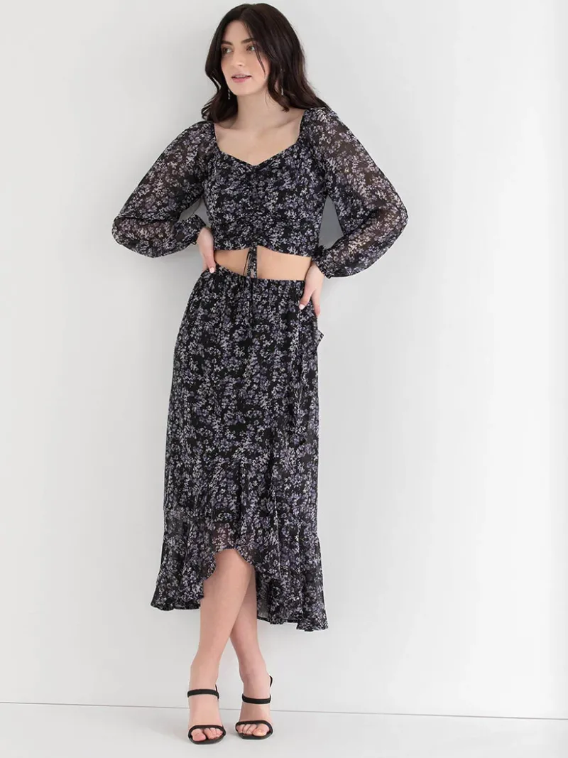 Give it a twirl. This is a midi-length skirt with an elasticized waist that is made from a light and sheer chiffon. It’s half lined to keep things modest and features delicate ruffles.