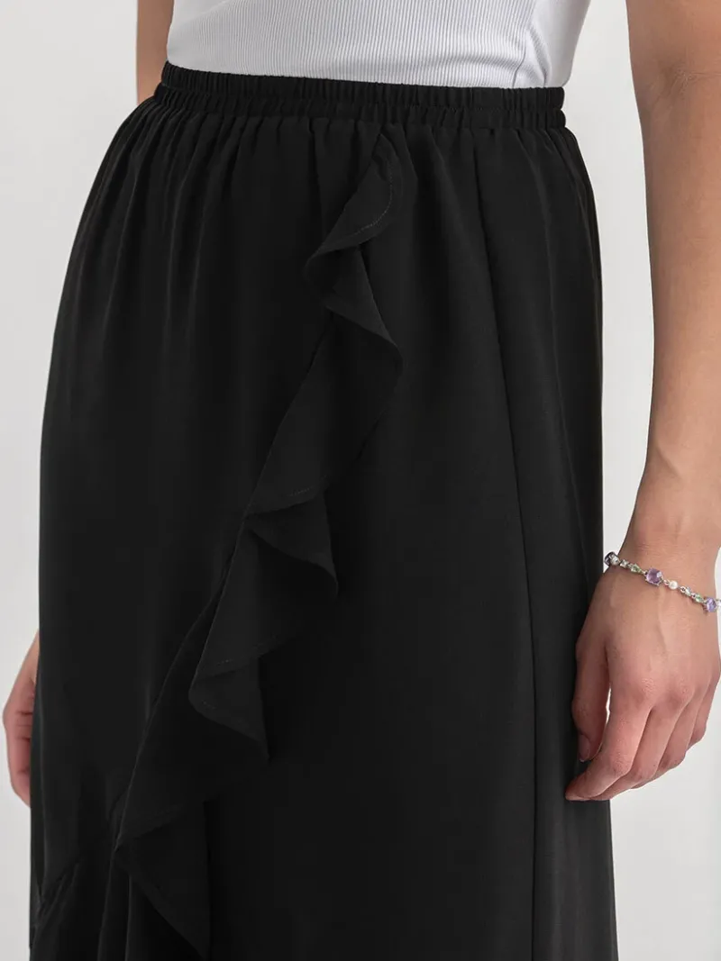 Give it a twirl. This is a midi-length skirt with an elasticized waist that is made from a light and sheer chiffon. It’s half lined to keep things modest and features delicate ruffles.