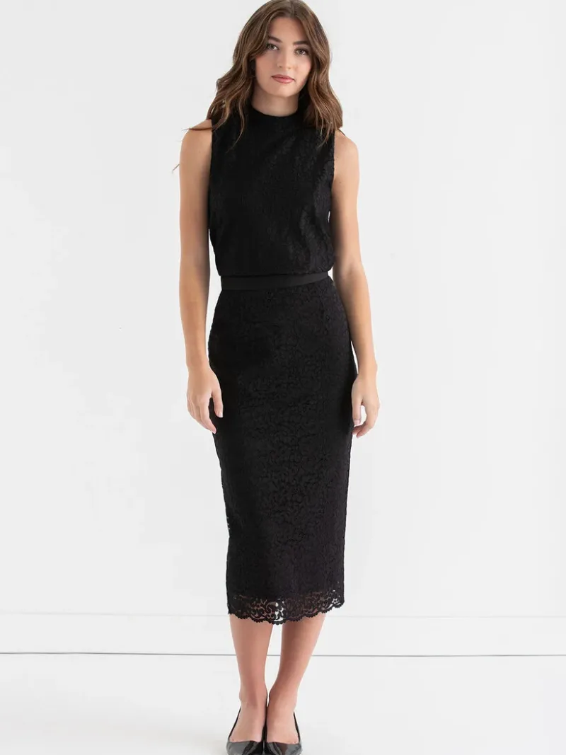 This lacy midi skirt is an easy way to bring a fun and feminine touch to any look. Featuring delicate lace over a satin lining, it’s a playful piece that’s easy to dress up or down.