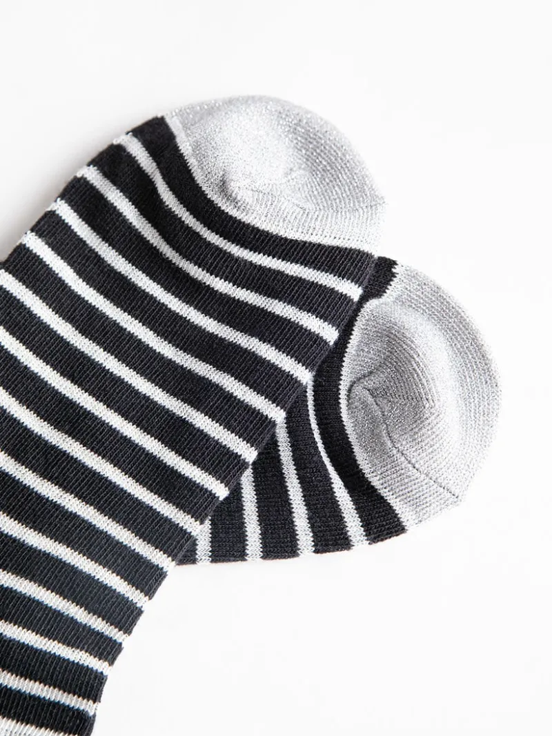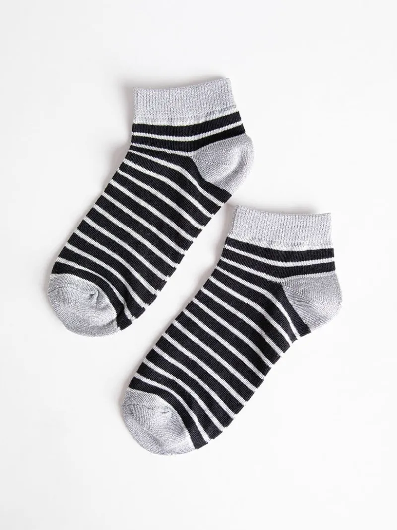 Put a little sparkle in your step with these ankle socks featuring stripes and a metallic shimmer in the trim, heel, and toe. They’re made with a breathable cotton blend for a comfortable all day fit.