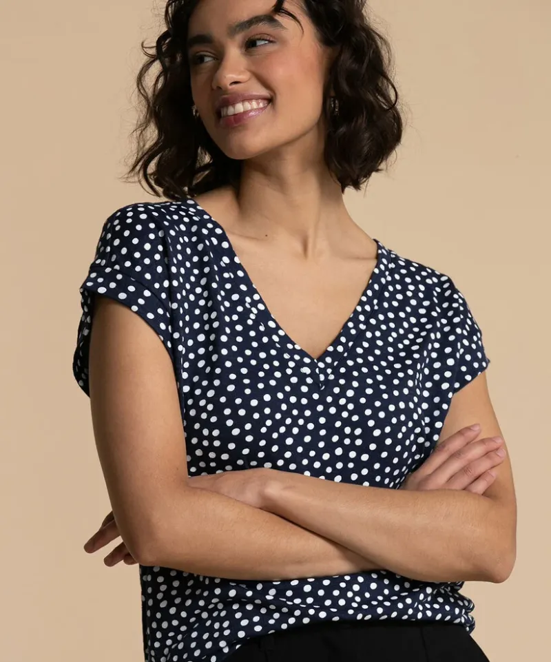 Not your typical tee. A relaxed everyday piece, this versatile t-shirt features a V-neck and angled short sleeves. It’s made from Hacci, a super-stretchy sweater knit fabric that works for any season.